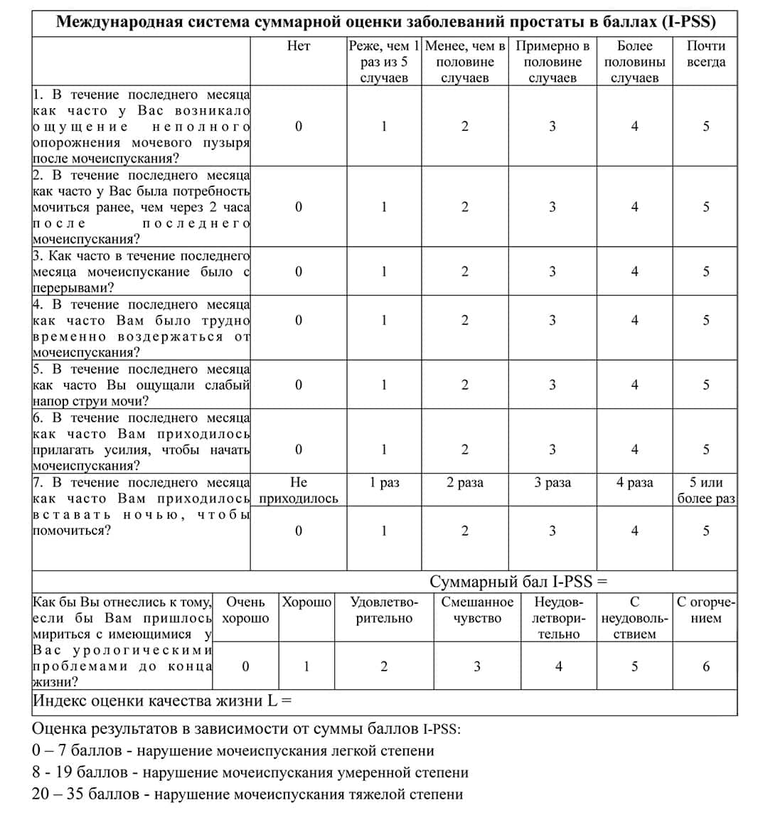 Международная система суммарной оценки симптомов при заболеваниях предстательной железы (IPSS) представляет собой анкету из семи вопросов, касающихся степени выраженности симптомов нарушенного мочеиспускания, и одного вопроса, оценивающего качество жизни